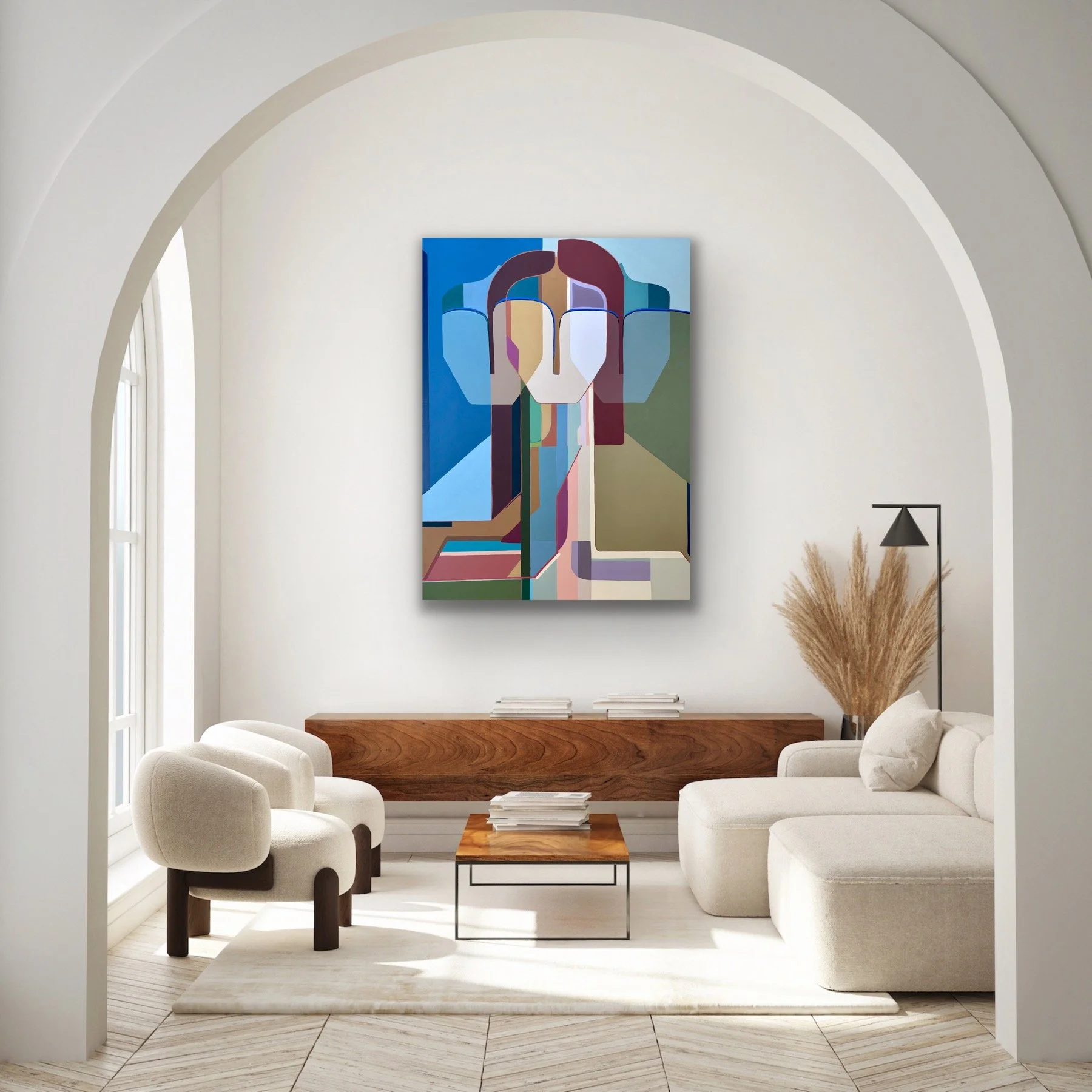 Inspired by architecture and the human form, Gina’s bold and vibrant one of a kind pieces dive into the beautiful balance of geometry paired with a dynamic palette.